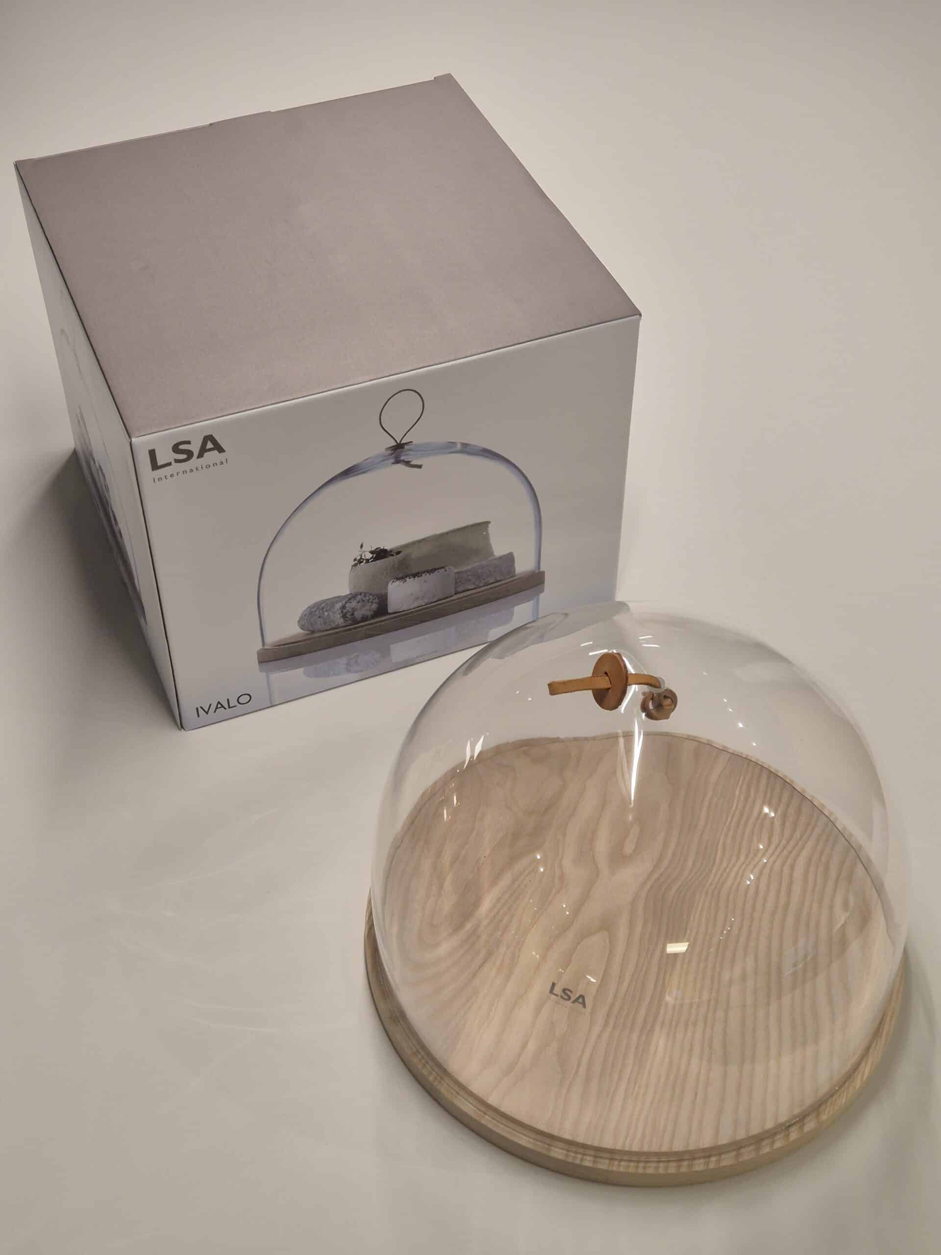 Grand dôme en verre soufflé avec poignée en cuir naturel et base en frêne massif.Diamètre 32 cm.