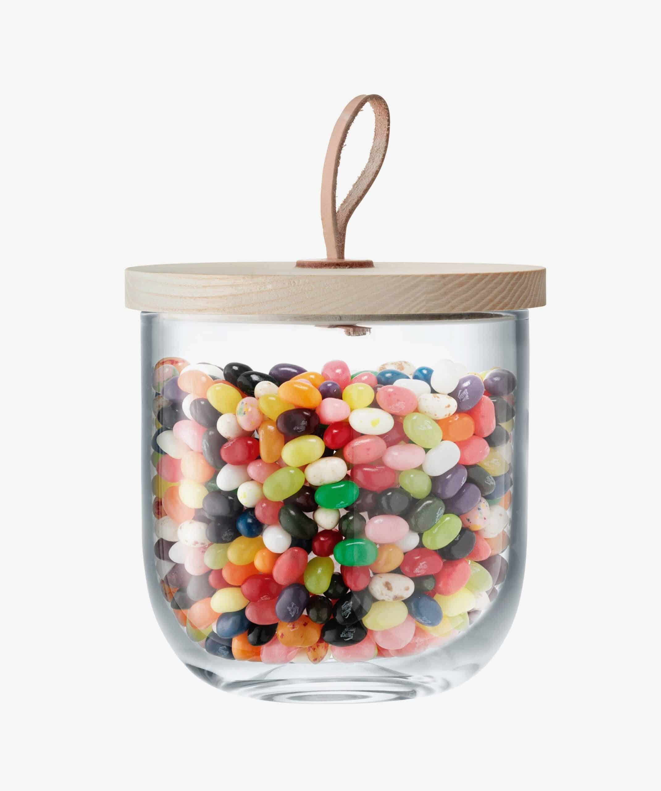 Récipient en verre soufflé avec couvercle en frêne massif et bouton en cuir naturel.