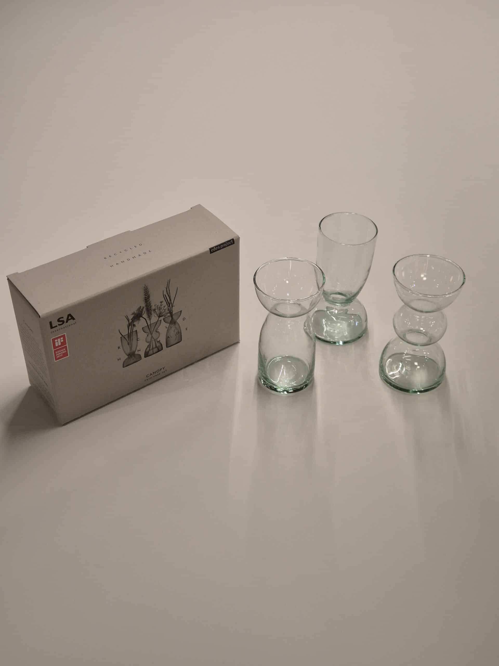 Ensemble de 3 petits vases en verre recyclé.Hauteur 13 cm.